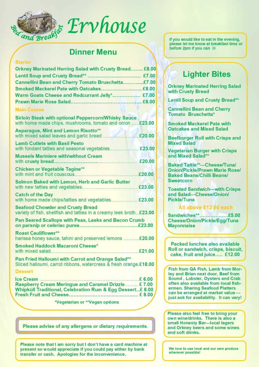 We offer breakfast as well as evening meals. Please see below for our evening menu.
